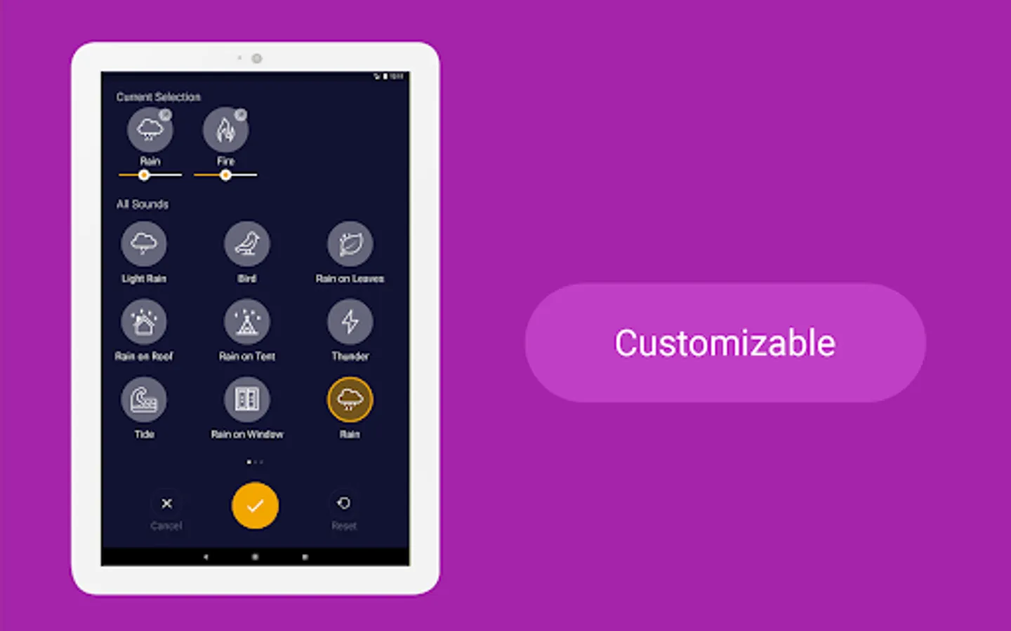 This Rain Sleep noise app is highly customizable and easy to use. You'll have everything in front of you. You can increase or decrease the volume of different sounds very easily, and add or remove different kinds of sounds to your rain sleep sounds combination.