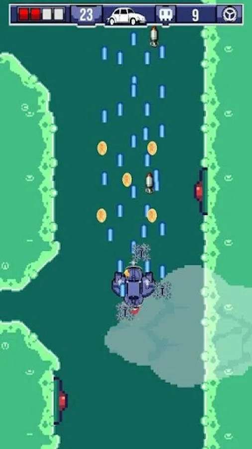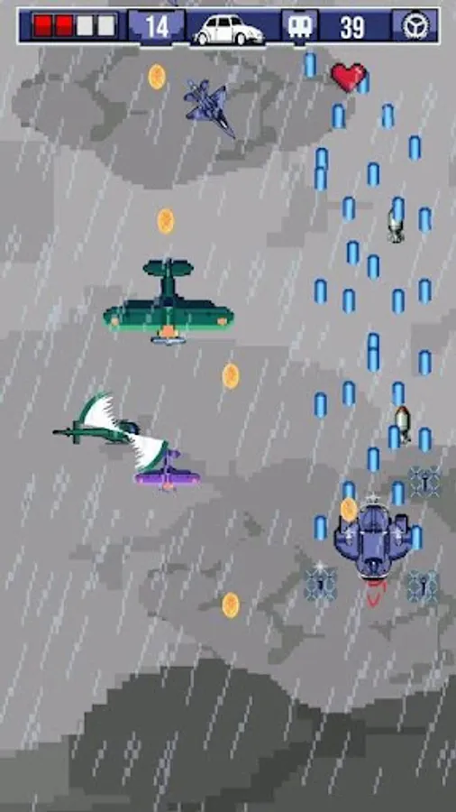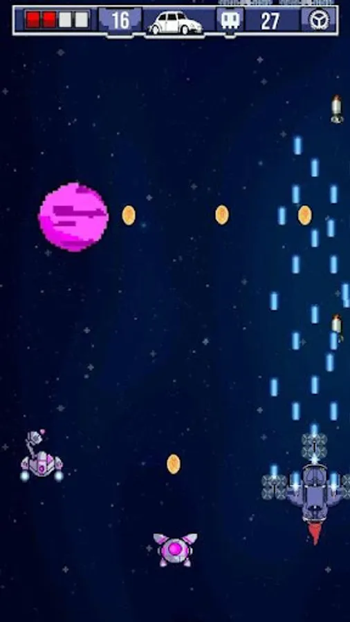 - collect coins and make your ship more and more powerful with and drones and firepower