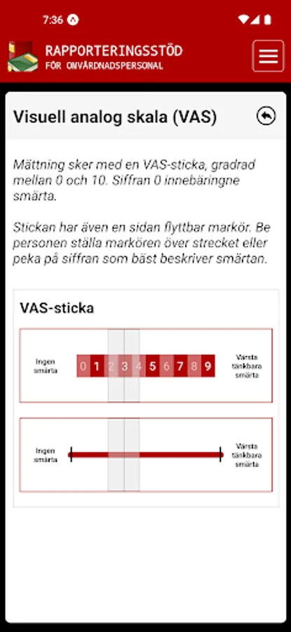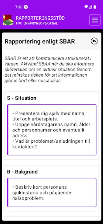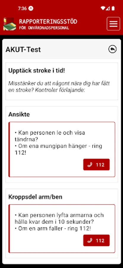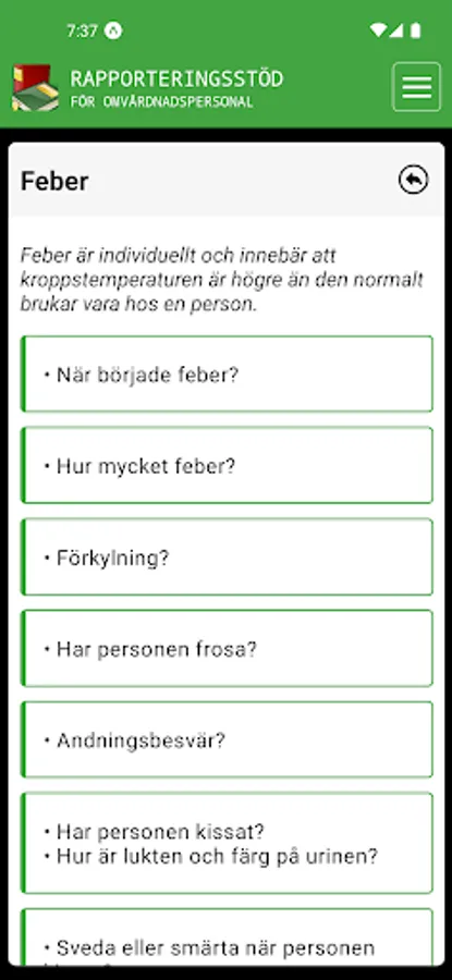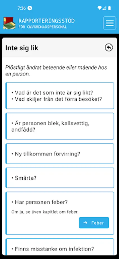 Rapporteringsstödet innehåller information kring vad du behöver ta reda på före du i samråd med personen, kontaktar en sjuksköterska.