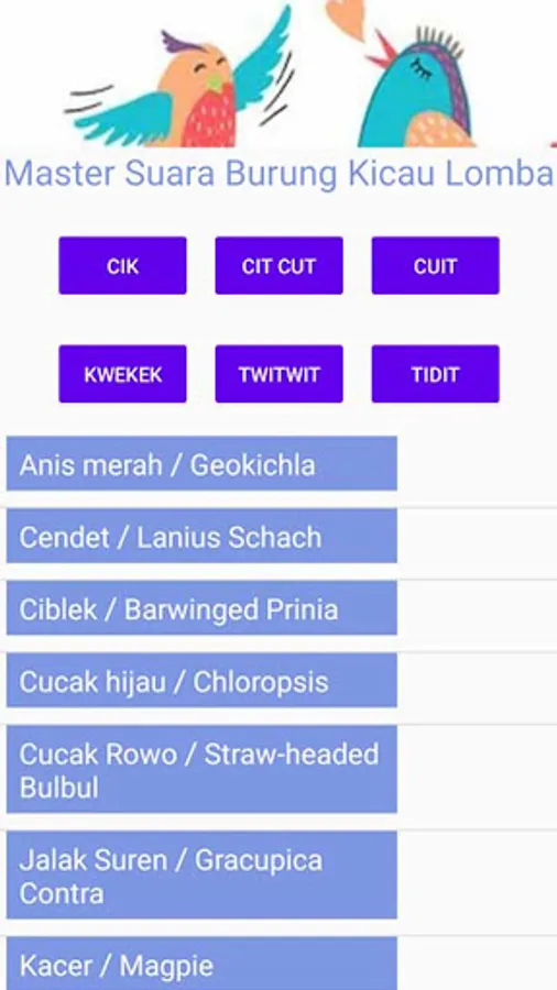 This application contains the usual sounds of chirping birds for competitions with good sound quality. So it is very suitable to be used as a master sound for your bird.