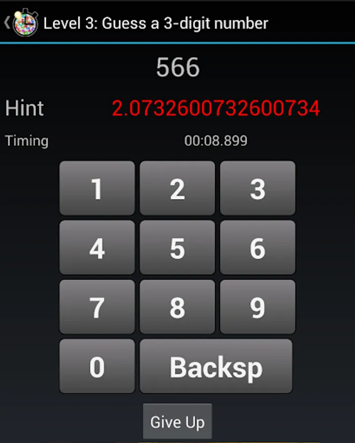 There are 9 levels in this game. In each level, you are suppose to guess a number (X), starting from a single digit number (the easiest) to the 9-digits number (the most difficult). After each guess, you will be given a hint that indicates how good is your guess. The closer the hint is to "1" the better.