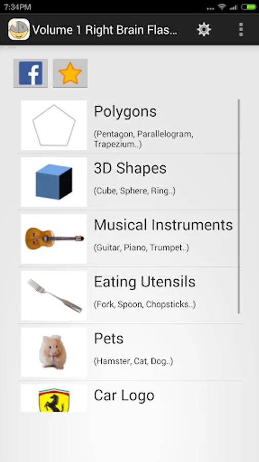 This flashcards app contains Polygons, 3D Shapes, Musical Instruments, Eating Utensils, Pets, Car Logos, Weather and Planets.
