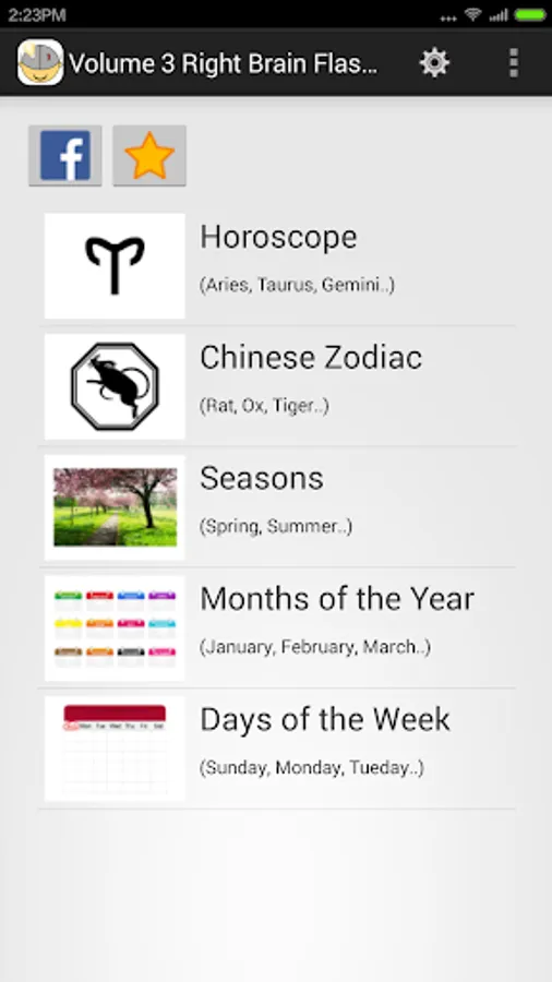 This flashcards app contains Horoscope, Chinese Zodiac, Seasons, Months of the Year and Days of the Week.