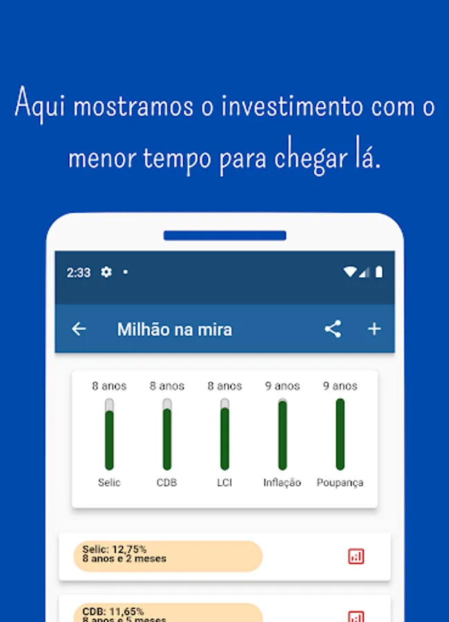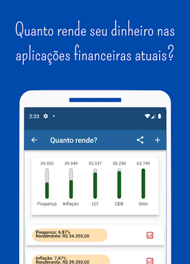 Application that uses current interest rates and inflation to make financial projections. In this way, you can check the best investment to leave your money through projections that inform profitability, liquidity and the amount of taxes you need to pay in each application. Calculations used if you want to enter the world of online sales are also provided.