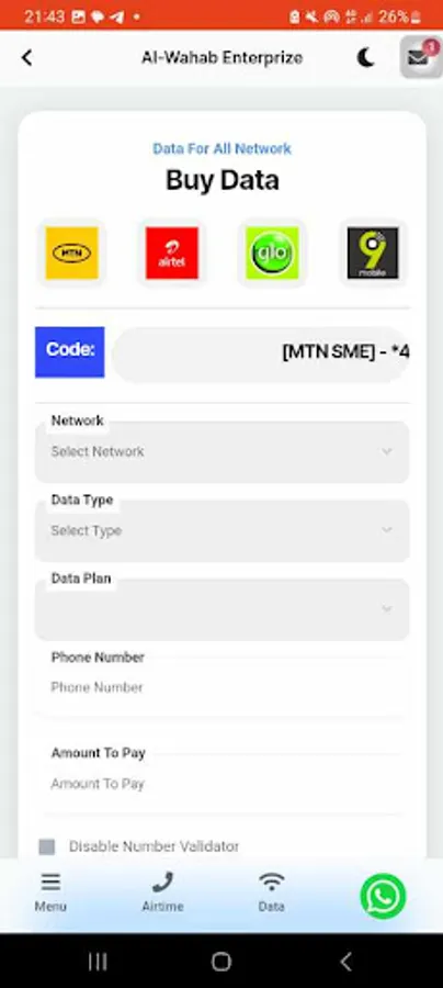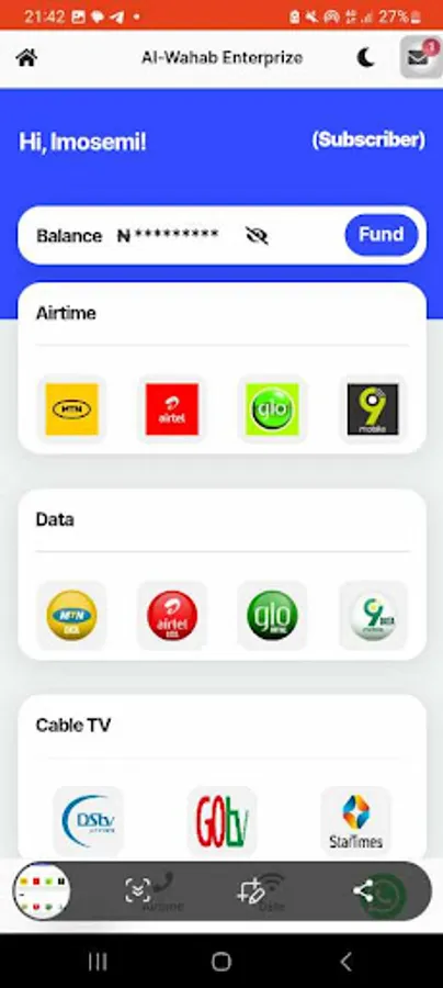 Al Wahab Enterprize is an Information and Communication Technology, and Telecommunication Company currently offering voice and data transmission services such as Mobile Data, Cable Tv Subscription, Electricity Bills Payment, Airtime (VTU), ... and so much more.