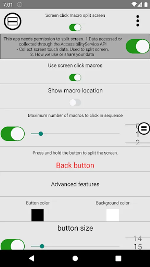 Accessibility services are required when clicking on the screen with a macro. This service is also required when showing the notification bar. No user data is used or collected.