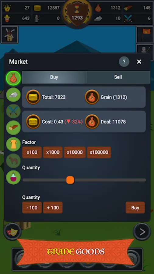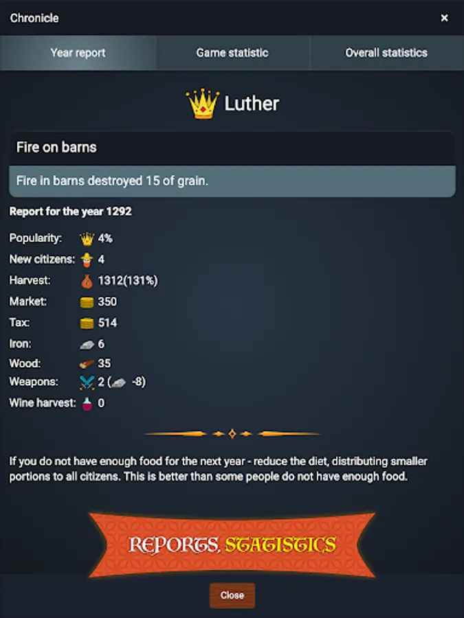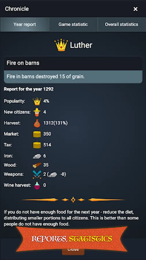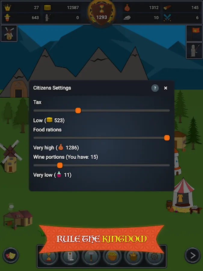 There is no one right decision for passing - you will have to build a winning strategy yourself (and if you have, let me know, I will remove it!)). During the game, you will have random events that may affect the course of affairs in your kingdom; every new year your farm will generate grain income depending on the yield; prices in your market will vary from year to year.