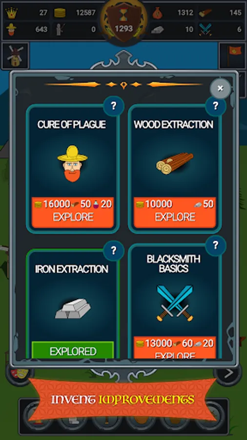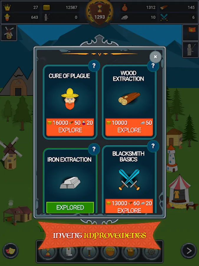 Your court alchemist and scientist, Bernard, will help you develop your kingdom from a scientific point of view: do research, make improvements for your sawmills, mines, to protect your barns from fires and other invasions. (But money and resources will have to be allocated for this - it there another way?))