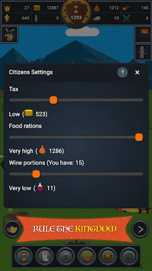 There is no one right decision for passing - you will have to build a winning strategy yourself (and if you have, let me know, I will remove it!)). During the game, you will have random events that may affect the course of affairs in your kingdom; every new year your farm will generate grain income depending on the yield; prices in your market will vary from year to year.
