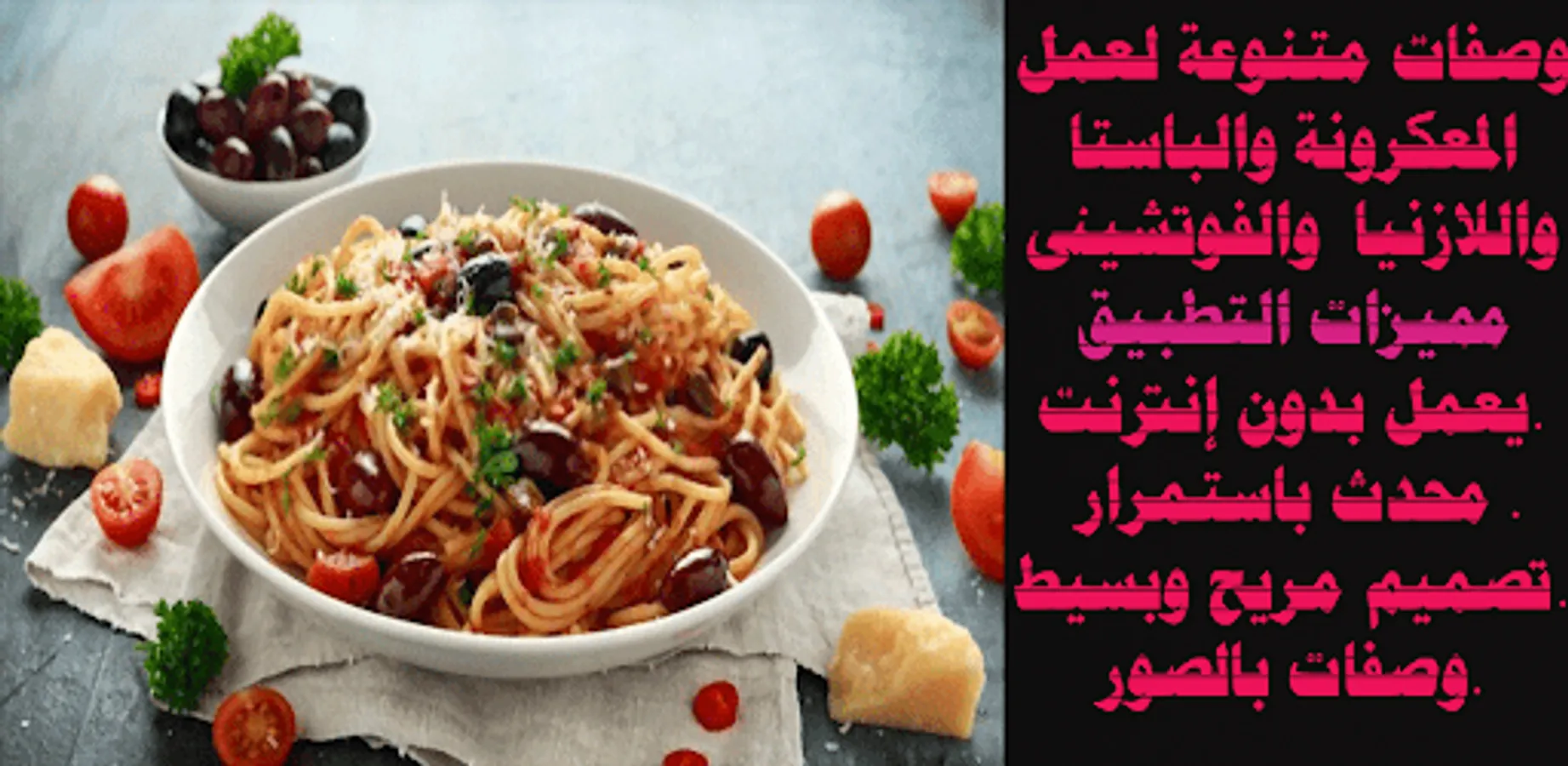 This application contains a variety of oriental and western pasta in various forms, in easy ways, and in various sauces. Pasta with chicken, pasta with mushrooms, pasta with vegetables, pasta with mayonnaise, pasta in white and red sauce and many more.