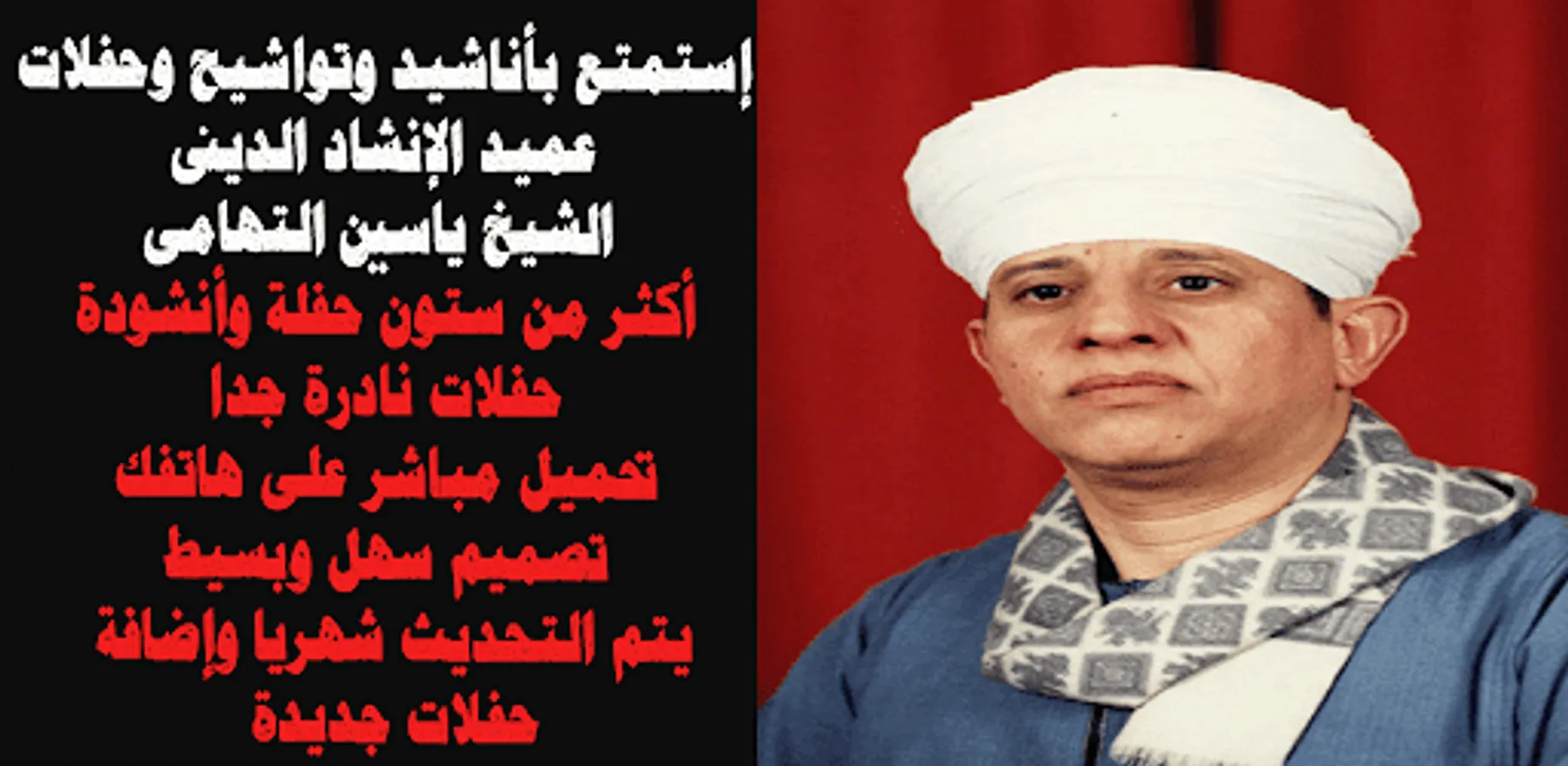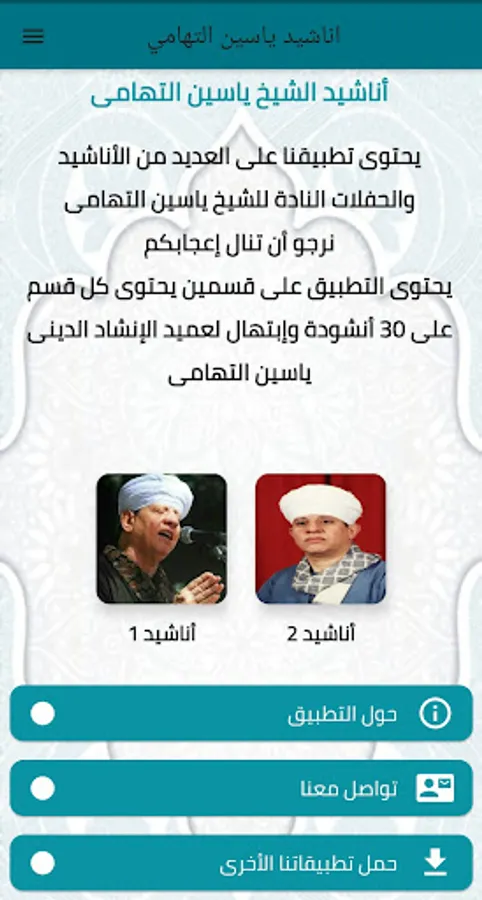 Welcome to the application of the songs and parties of the dean of religious chant Sheikh Yassin Al-Tohamy. You can listen to the chants online directly online for users who do not prefer downloading the songs, but rather prefer listening to them directly and saving on the amount of memory consumption on the phone. Constantly updated live listening links.