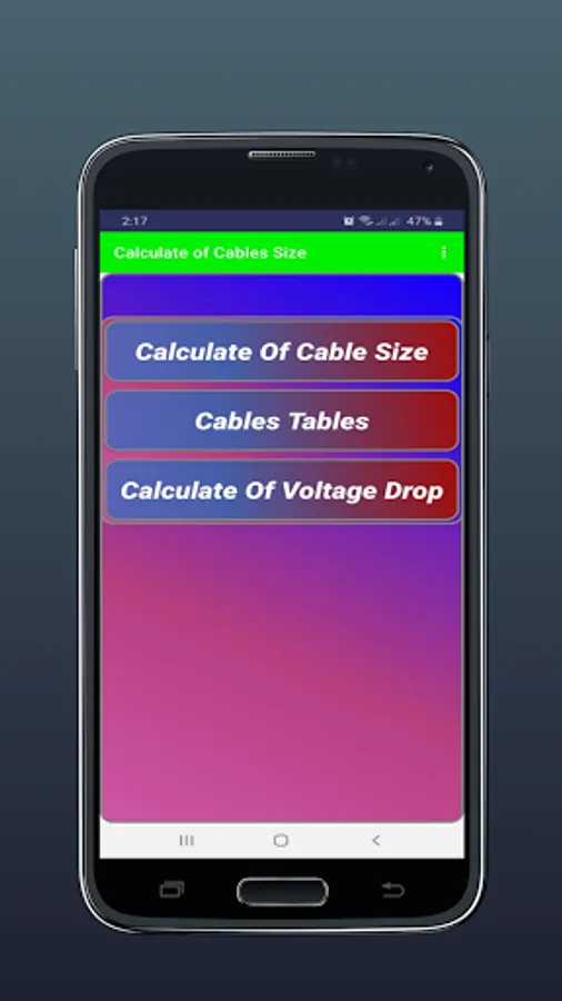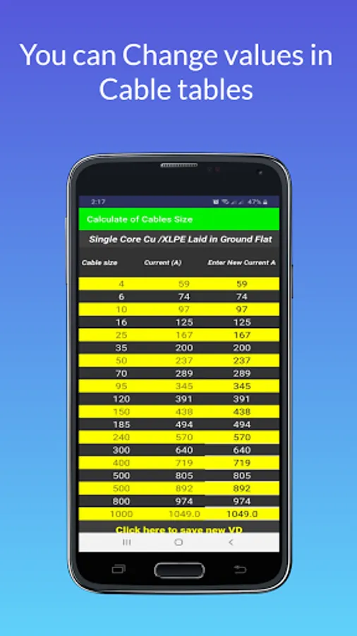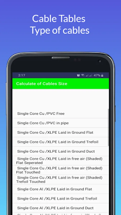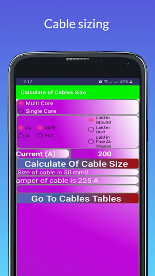 This application calculates the size of the cable based on the electric load (electric current)