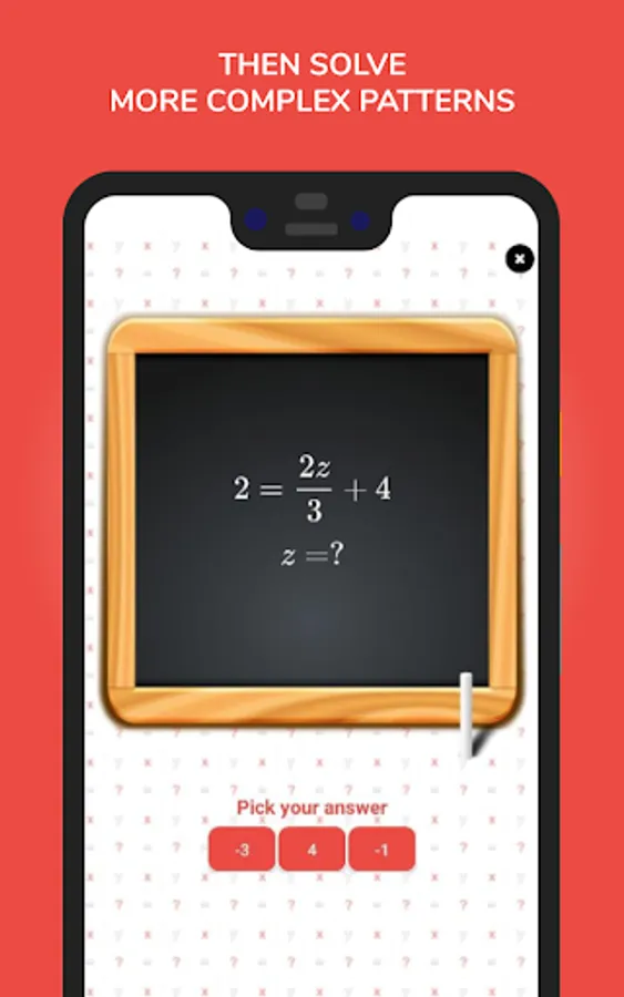 Inside of each quiz in a level, player will be asked to find the missing value of an unknown number that is represented by a letter symbol (e.g: x,y). The lesson in each level provides player with the skill required to find the missing value.