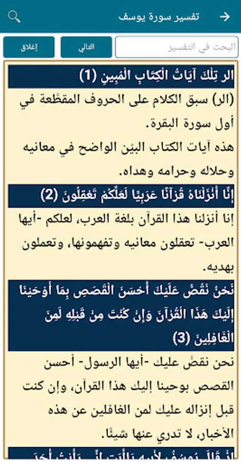 Through the application, you can read the interpretation of the surahs of the Noble Qur’an completely and for free, and you can copy the interpretation of the verse and send it to anyone you want, you can also quickly search for the interpretation of any verse.
