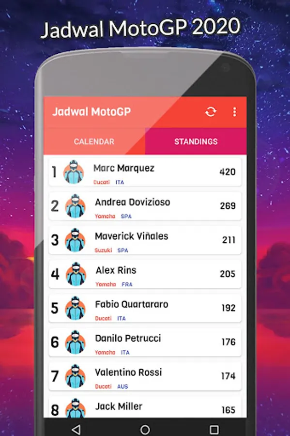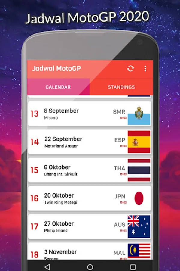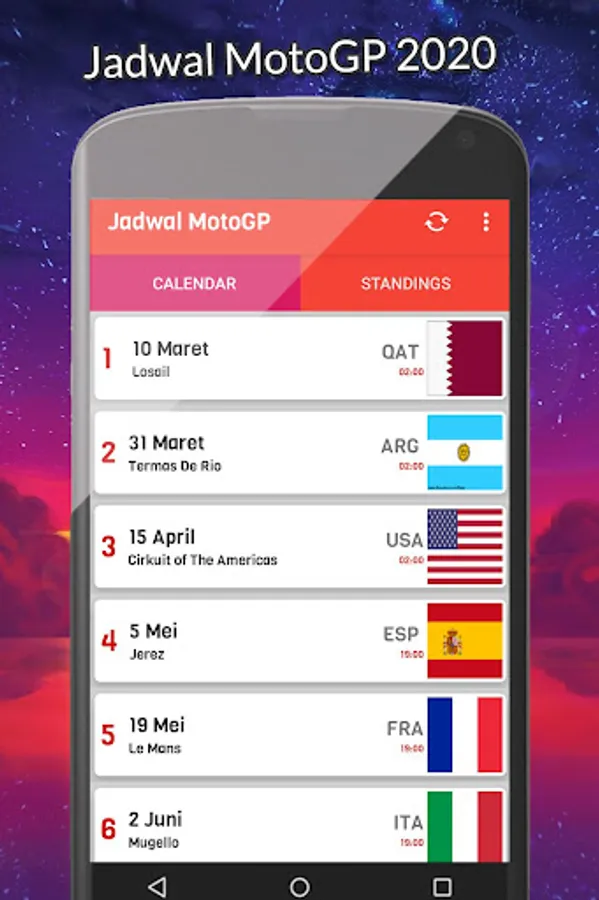 This application displays information in the form of a calendar / race schedule and the current MotoGP standings. For those of you who are lovers of Moto GP, may be useful with the services we present.