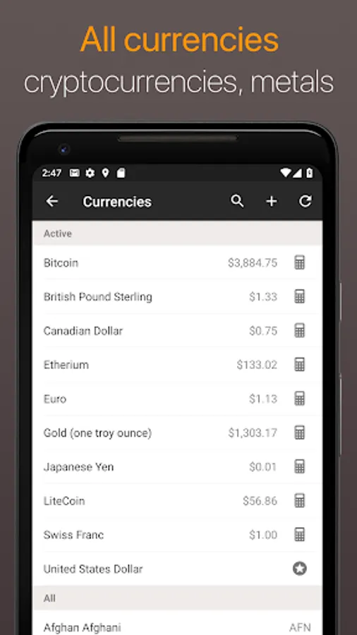 The program supports an unlimited number of currencies. Initially, the list already contains almost all currencies of the world, plus precious metals. Also you can add your own currencies, including "virtual" ones, i.e. you can keep track of money and other things (metals, petrol, units of measurement). Exchange rates can be downloaded from the Internet.