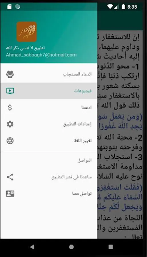 أهلا وسهلا بكم في تطبيق لاتنسى ذكر الله , التطبيق صغير الحجم ولا داعي لابقائه مفتوح فهو يعمل في خلفية الشاشة اثناء تصفحتك للهاتف ويقوم بارسال التذكير بالاستغفار والتسبيح بشكل دوري , كما يمكنك ضبط مواقيت ارسال التنبيهات , كما يوفر مقاطع دينية يمكنك مشاهدتها بشكل مباشر من التطبيق وغيرها من الادعية