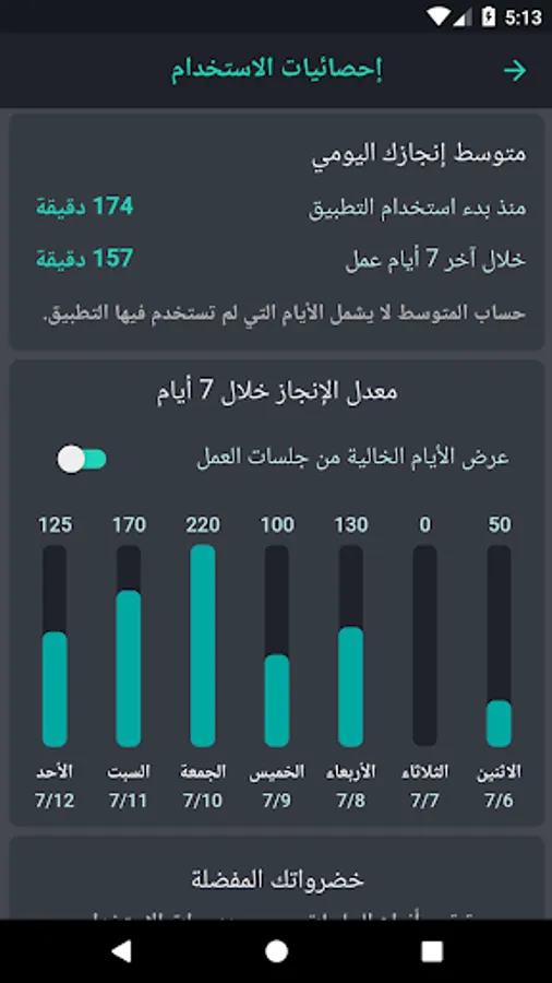 يساعدك التطبيق أيضاً على تتبع الوقت الذي تقضيه في العمل على نشاط أو مشروع أو هدف معين. كما يعرض لك بعض الإحصائيات التي تساعدك على تقييم أدائك وتحسينه.