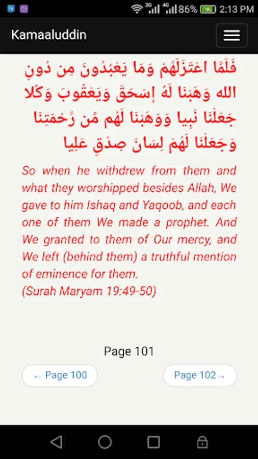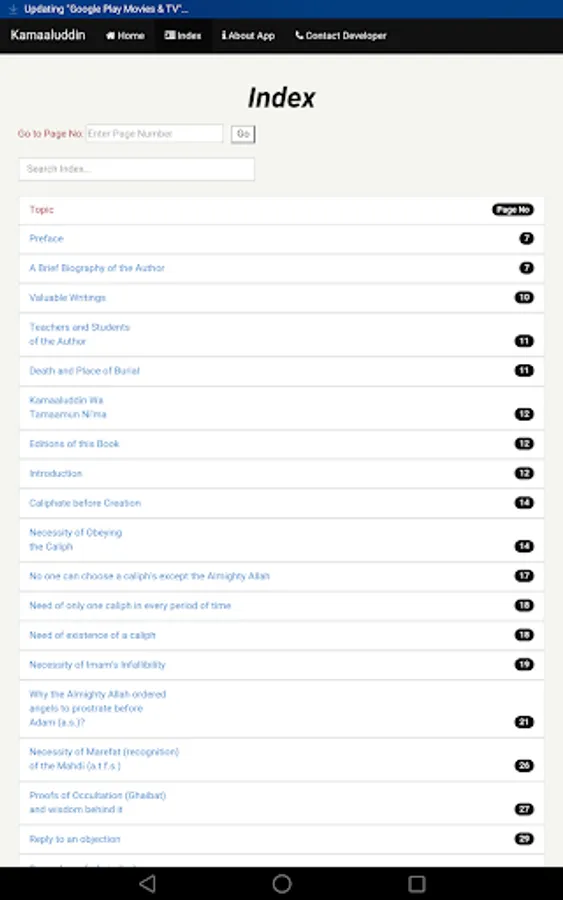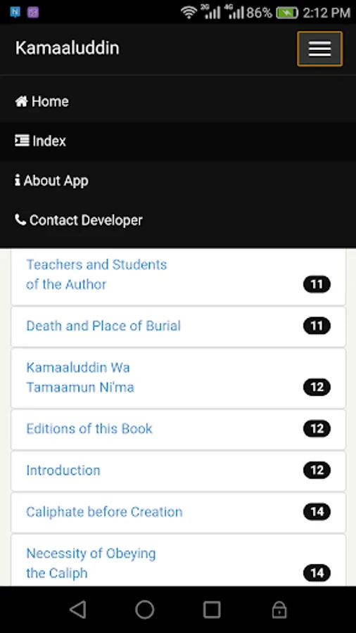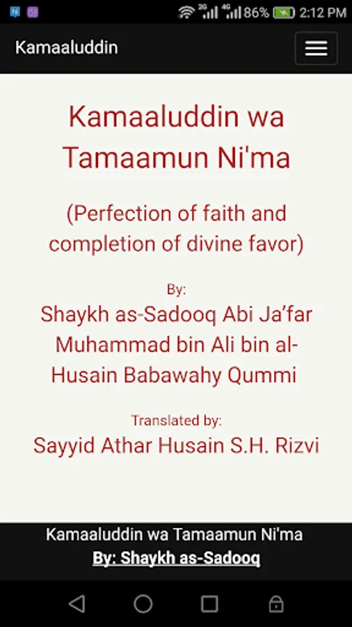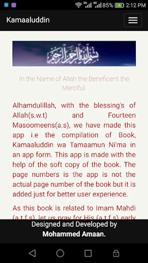 Alhamdulillah, with the blessing's of Allah(s.w.t) and Fourteen Masoomeens(a.s), we have made this app i.e the compilation of Book, Kamaaluddin wa Tamaamun Ni'ma in an app form. This app is made with the help of the soft copy of the book. The page numbers is the app is not the actual page number of the book but it is added just for better user experience.