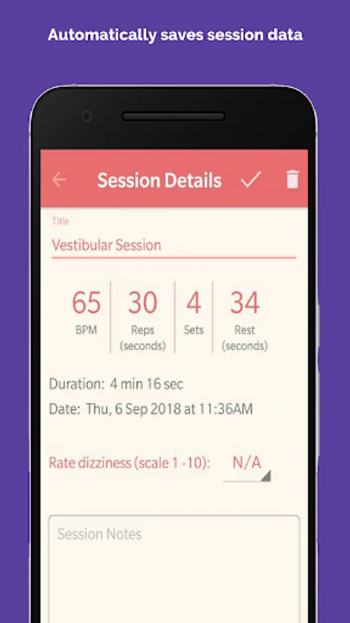 If you’ve been prescribed exercises in vestibular rehab (please see below for types of exercises), Vestibio can help you easily get them done. Enter all your prescribed info (sets, reps, rest and speed), press the start button and Vestibio will guide you through your whole workout. Once the workout is complete, your session is automatically saved - you can even enter session notes and a dizziness level!
