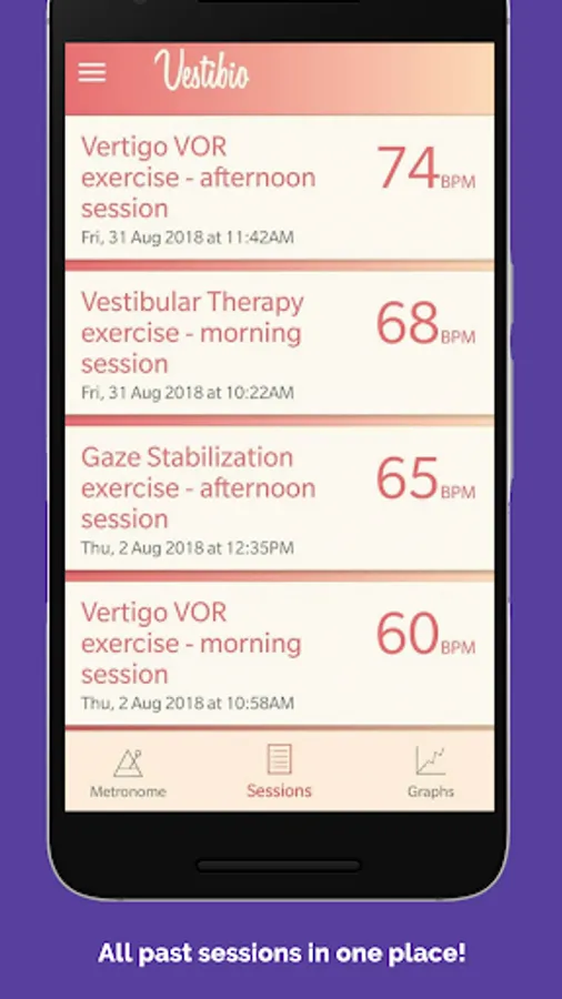 Vestibio enables both patients and practitioners to perform vertigo exercises in vestibular rehab therapy (VRT) without the need of a separate timer, metronome app and other devices. It’s in all in one programmable metronome and it’s FREE!