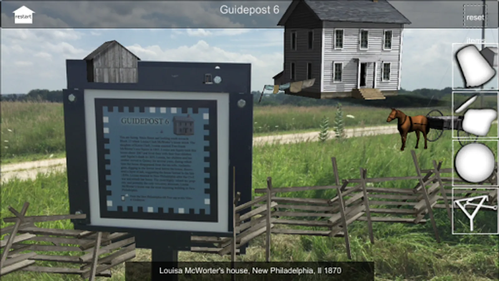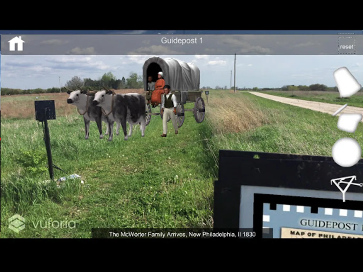 The New Philadelphia AR Tour App is intended for use while visiting the New Philadelphia site in Pike County, Illinois. The App works by recognizing 1 of 5 Guidepost signs positioned along the visitor path at the New Philadelphia National Historic Landmark. When a Guidepost is viewed through a mobile device, visitors are able to view virtual reconstructions of the town in their approximate locations and access informational content.