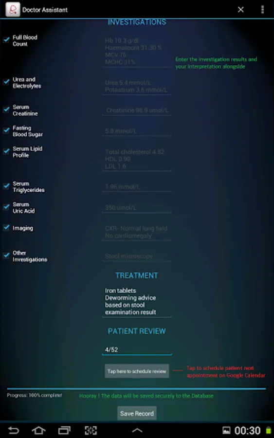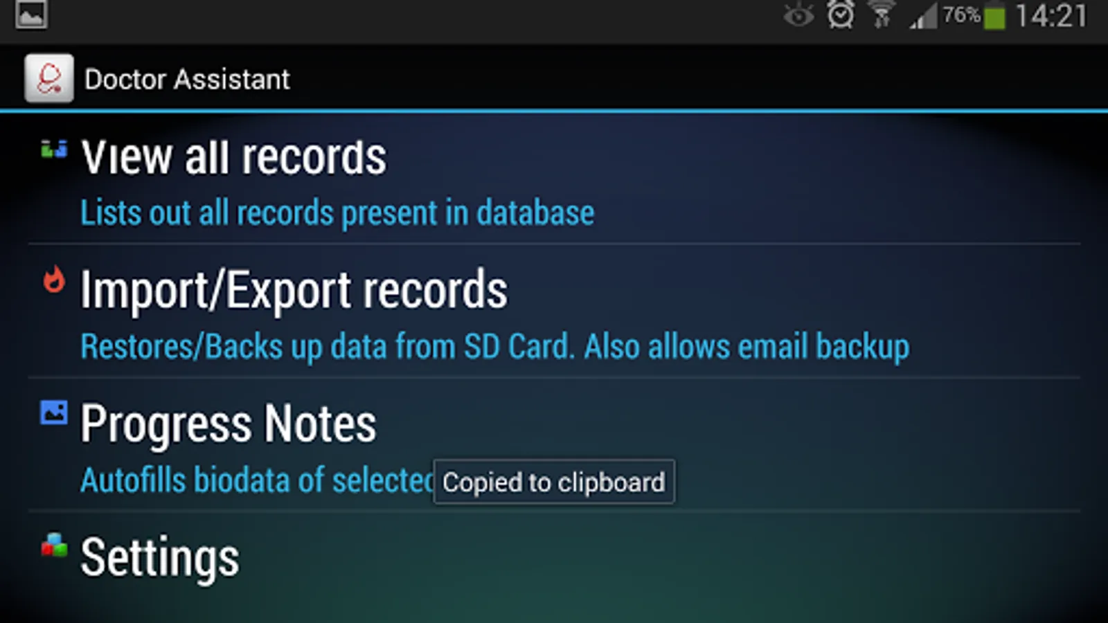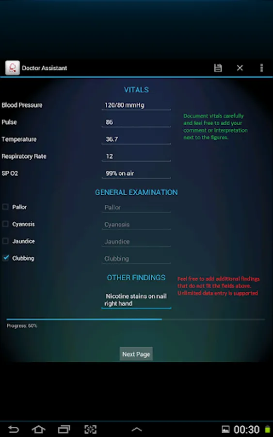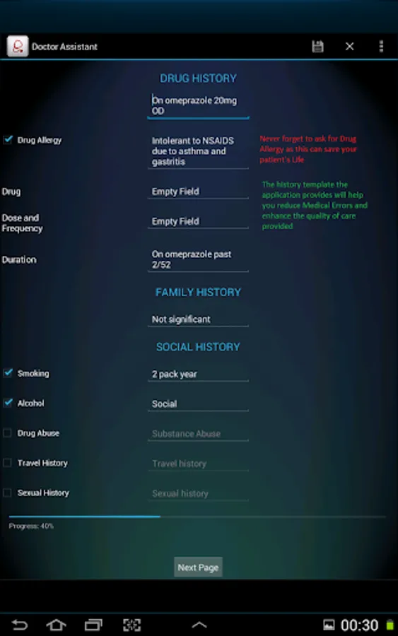 Doctor Assistant is an easy-to-use app, that helps you stay organized and improve productivity. It is an app that turns your coveted smartphone/tablet into a powerful medical tool. Designed to fit your busy schedule, you will find a sleek, user-friendly interface that will boost your efficiency. The history template provide will help you enter essential data regarding patient management.