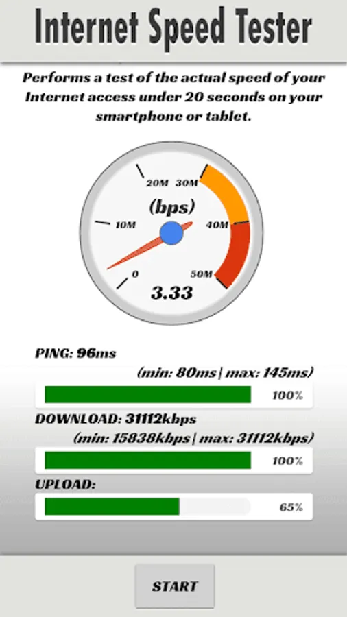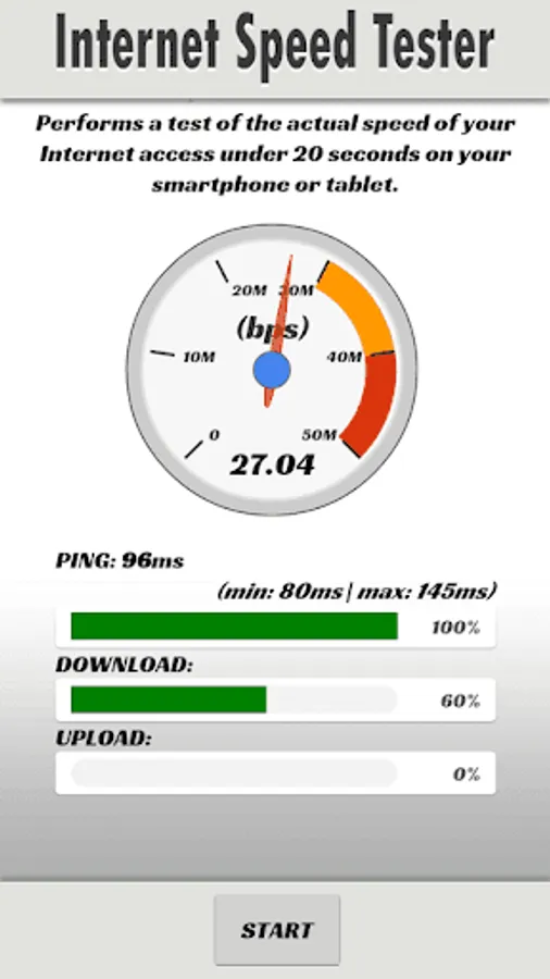 Internet Speed Tester performs a test of the actual speed of your Internet access under 20 seconds on your smartphone or tablet.