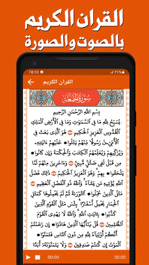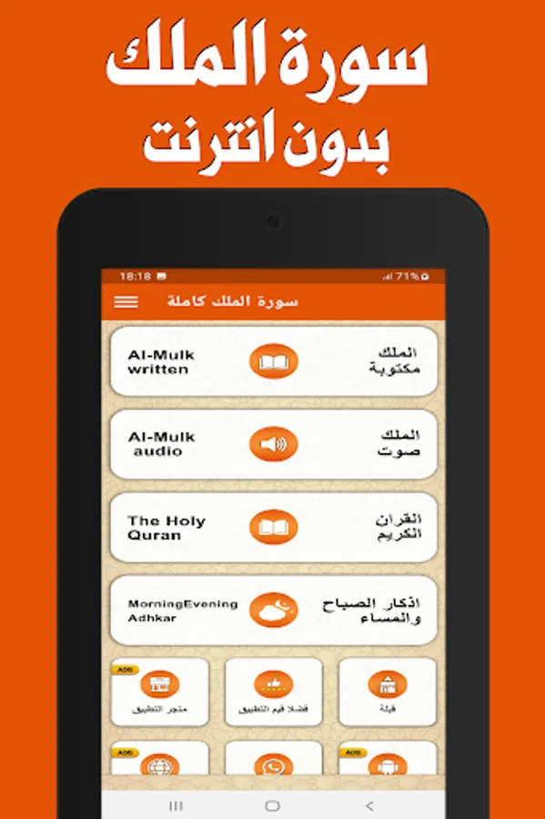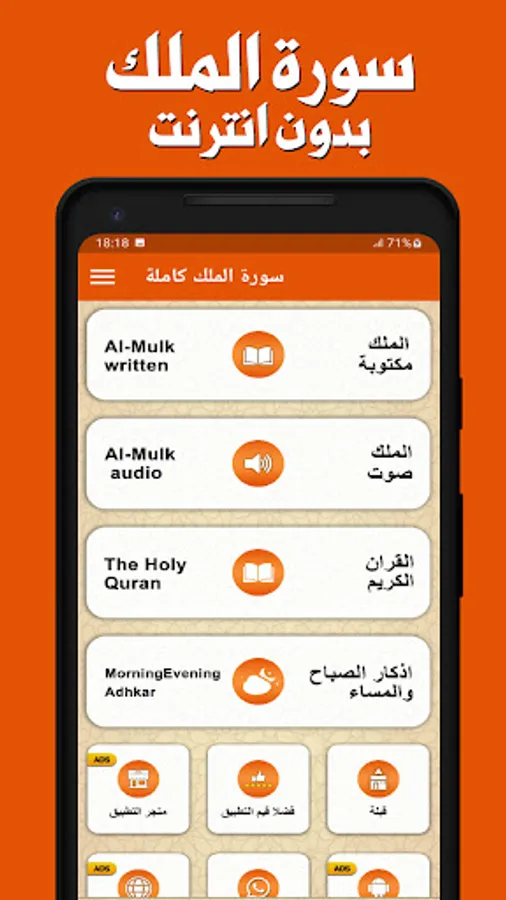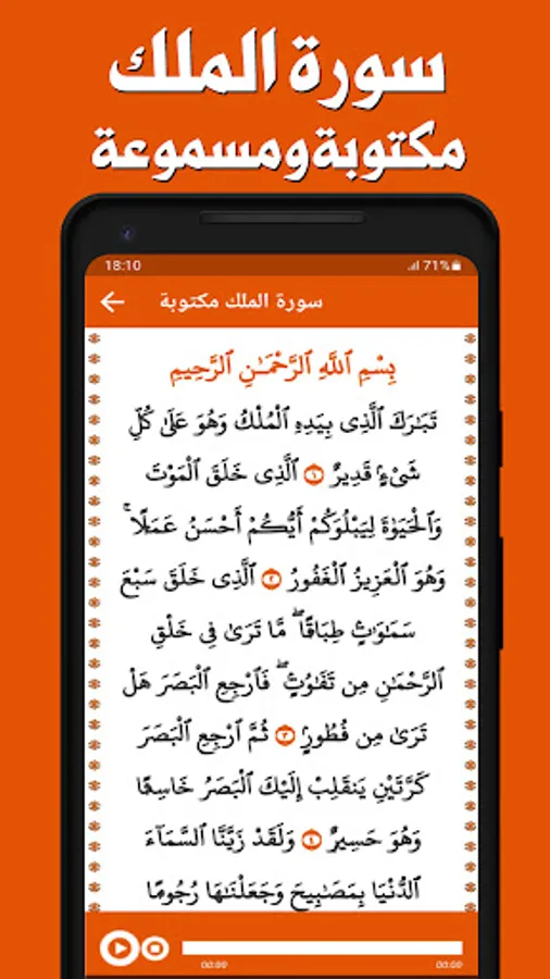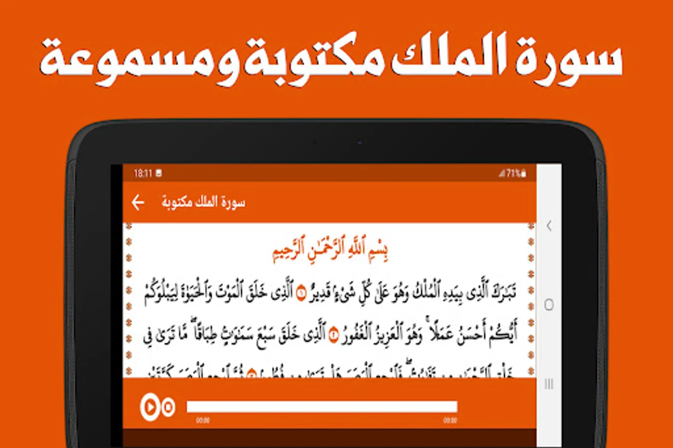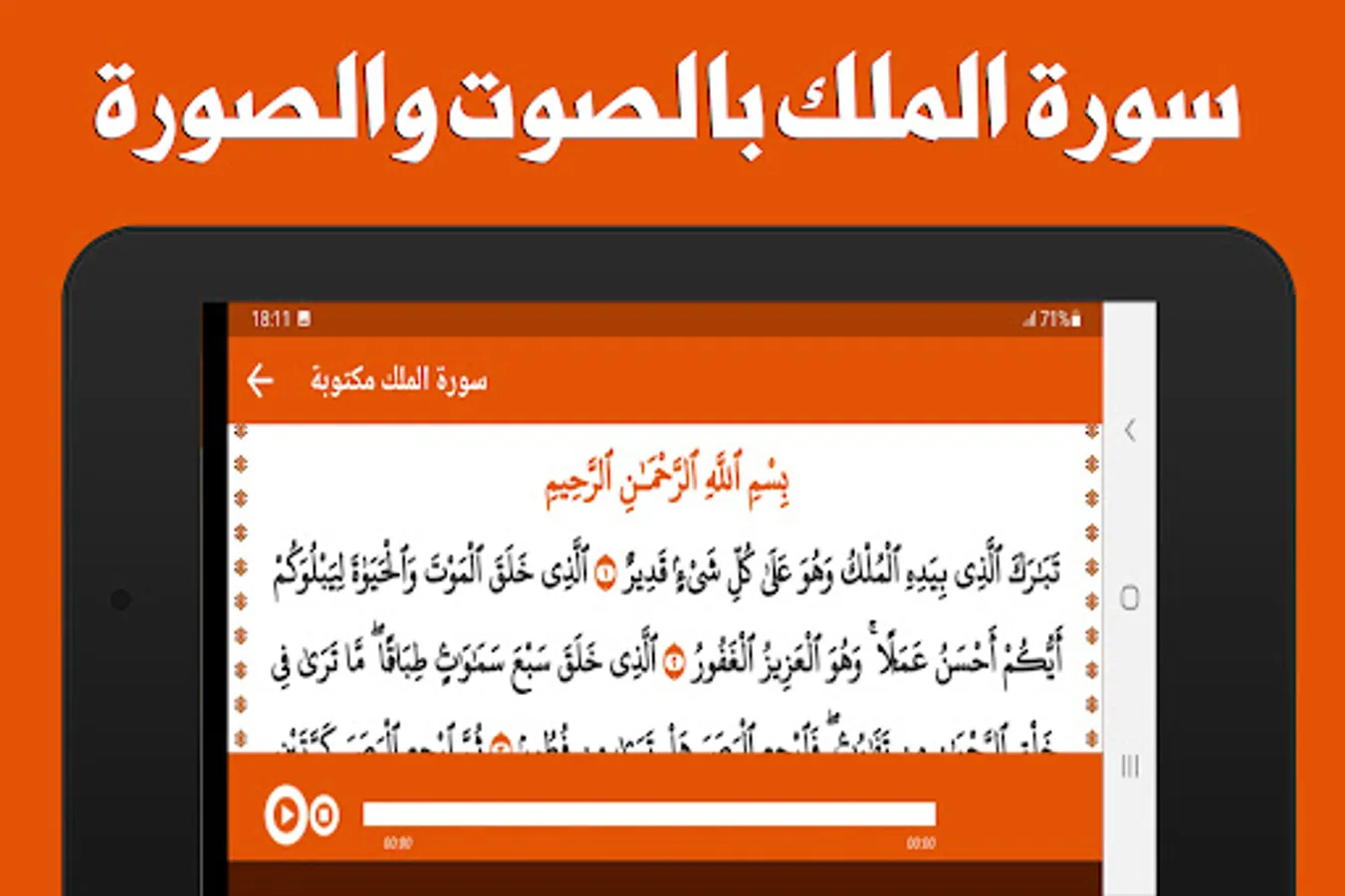 Surah Al-Mulk complete without the net is a very useful application for those wishing to hear the image of the king audio without the internet and with high quality, and it also enables you to memorize and listen to the surah later without the net. And this version is reading workshops with formation