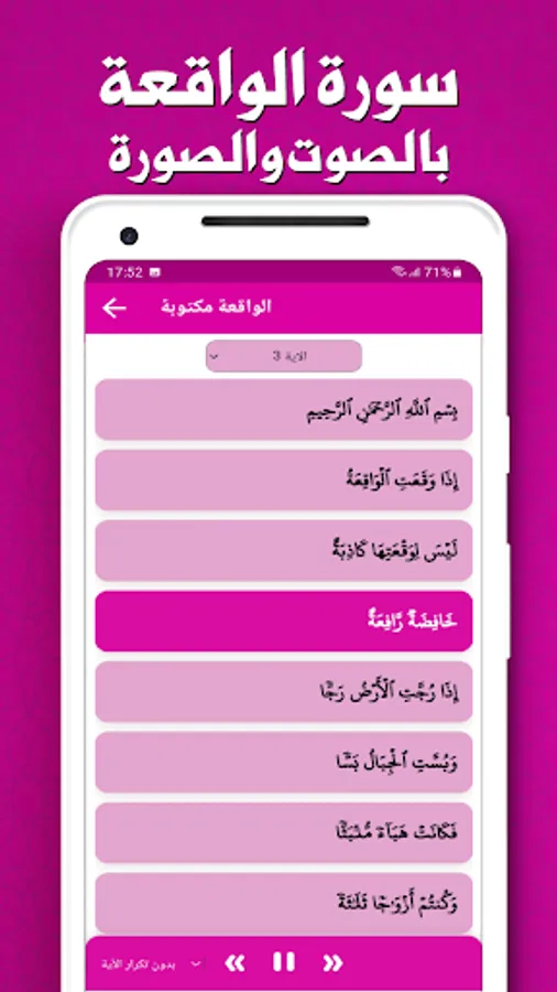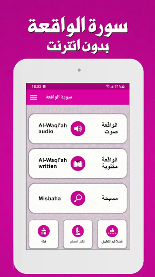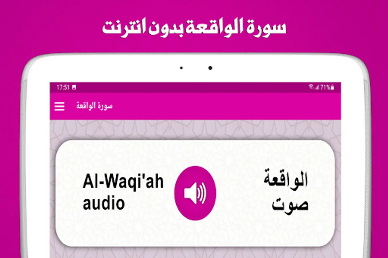 The program contains Surat Al-Waqi’ah written and audio, and it works without the net, with the voice of the most wonderful Arab readers.