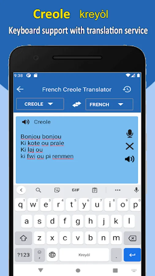 French Creole Translator & Creole French Translator Application will help you to translate word and text as well as Voice from French to Creole Translation & Creole to French Translation.