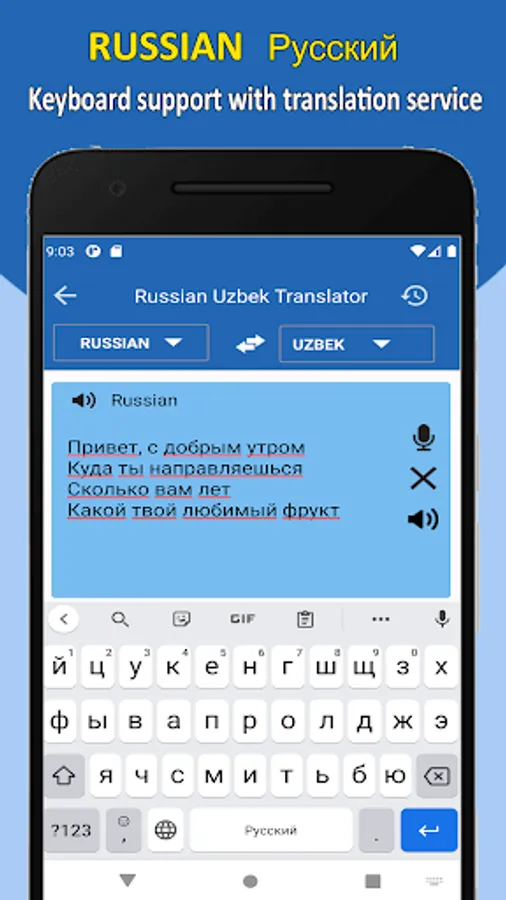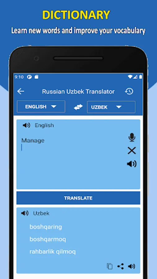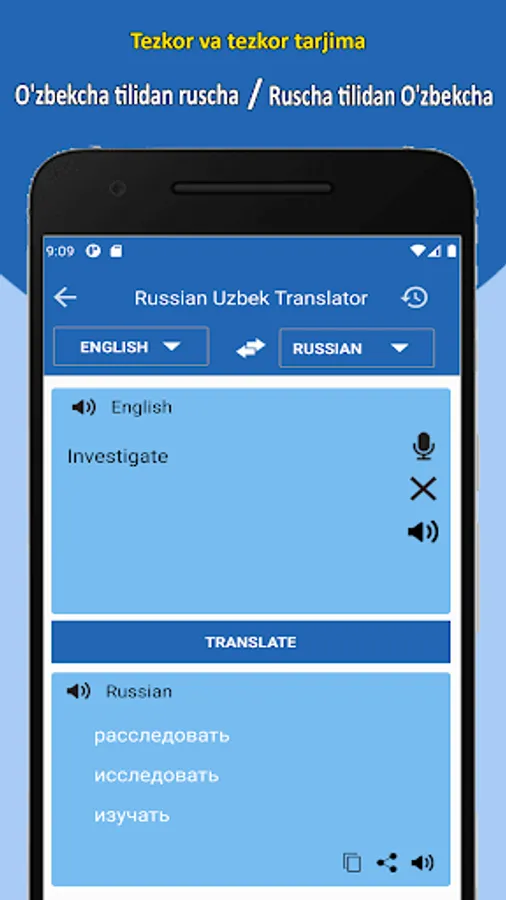 Russian Uzbek Dictionary is the best Android Application for easy and fast translations, which can be used like a dictionary. You can translate words and sentences, helps to learn languages.