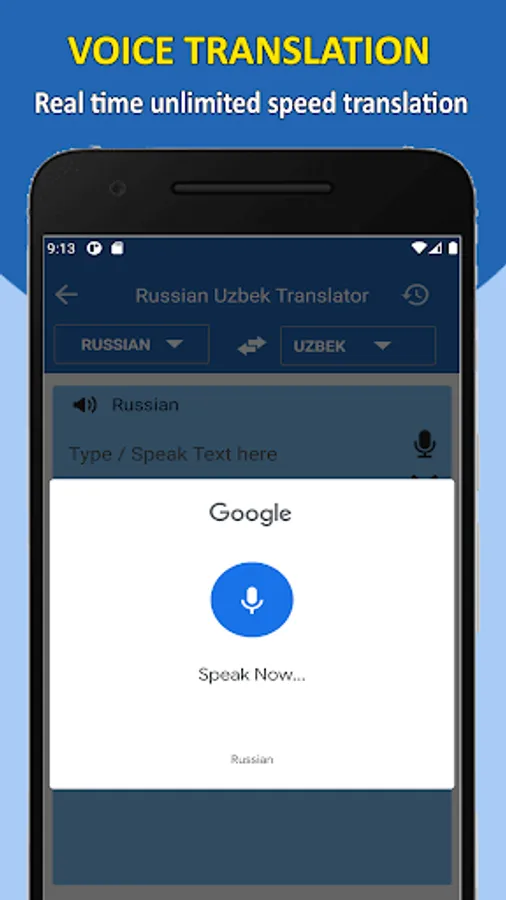 Text to Speech Feature - Russian to Uzbek translator has a unique conversation feature. The user can use it by touching the text-to-speech function in the app and speaking the English words or sentences that the user wants to translate into Russian and Uzbek.