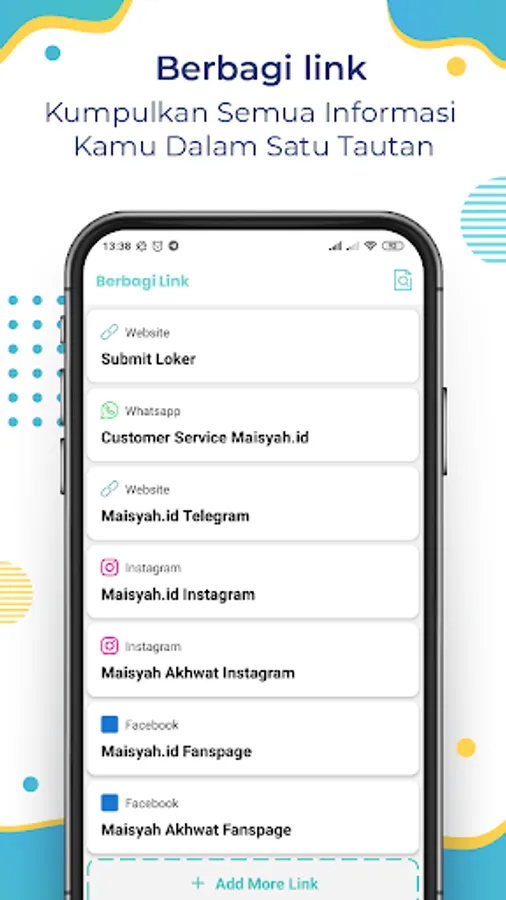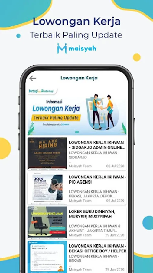 Upholding commitment as a Muslim company that can provide benefits to the world and the hereafter. Alhamdulillah, we have made an Android-based application which consists of sharing features & facilities of worship for Muslims and Muslims along with the sharing.link feature and job vacancy information from the maisyah.id team. Biidznillah