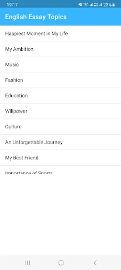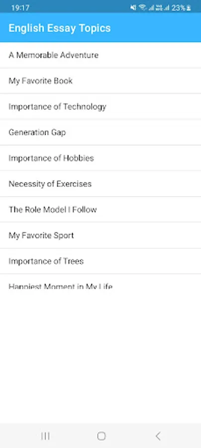 This app contains 25+ simple essay topics in English and allows you to type your essay on each topic given.
