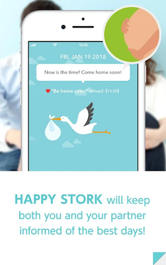 Happy Storkg assists couples hoping for a child. Although many women track and manage their ovulation and fertile days, it can be difficult to tell this information to the male partner. This can cause problems of timing and coordination on those days.