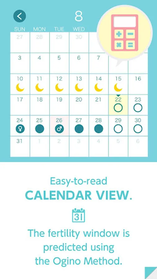 The app uses the Ogino method of calculation to compute days with high likelihoods of achieving pregnancy. The method's results are not certain, so please treat it only as a rough estimate.