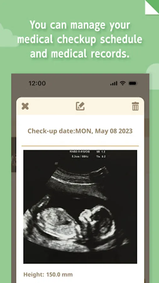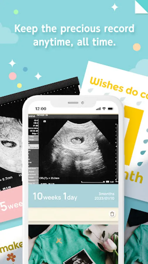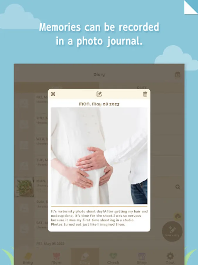 By recording your physical condition and medical checkup results, you can manage your ultrasound photos and weight records all at once. In addition, you can save your maternity photos and memories of your pregnancy as a photo diary together with your spouse.
