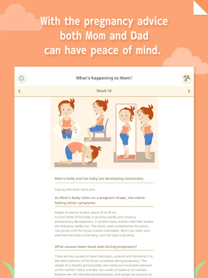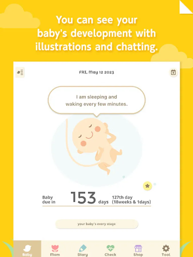 The cute illustrations of the baby will make different adorable gestures each time you open the app, and will grow based on the number of weeks of your pregnancy. The baby will also talk whenever you tap on the baby. The baby's lines changes every day, and will send you messages of encouragement and information on the baby's condition.