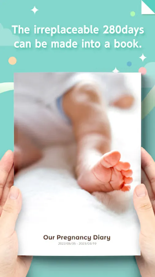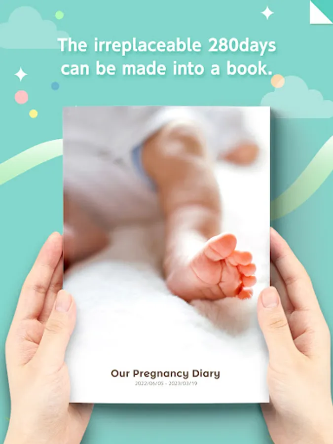 Preserve your priceless memories of your pregnancy saved in the app, such as ultrasound photos, maternity photos, diary entries and the cards you exchanged, in a single book.