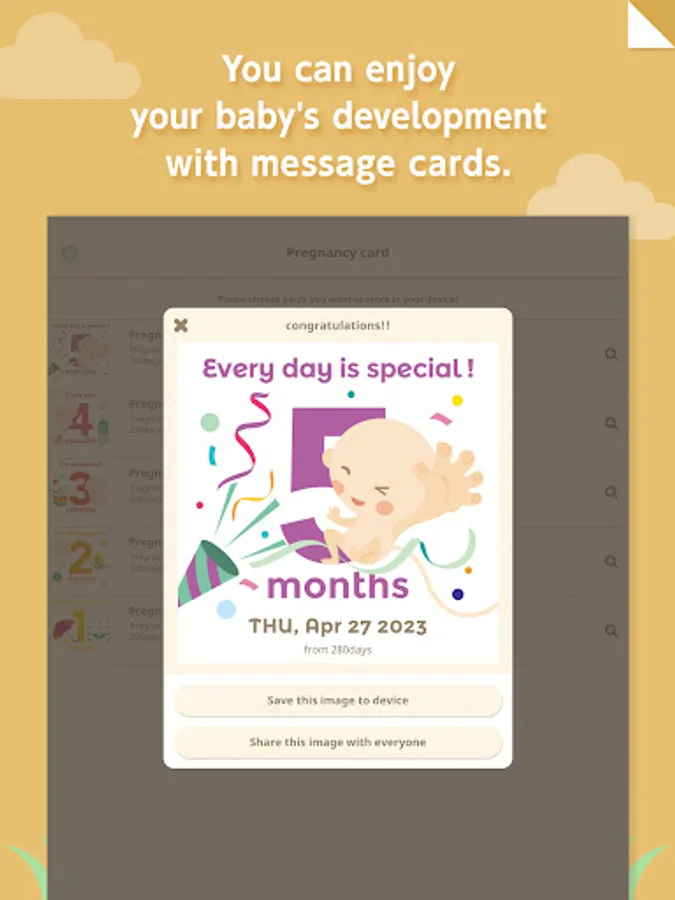 Enjoy your pregnancy even more by taking a commemorative photo of the baby's illustrations and upload it to your SNS, or send message cards celebrating your baby's growth!
