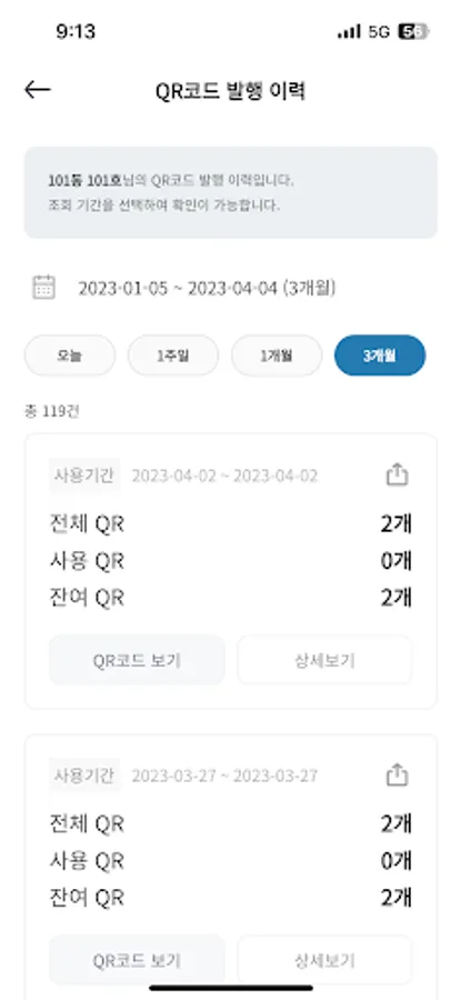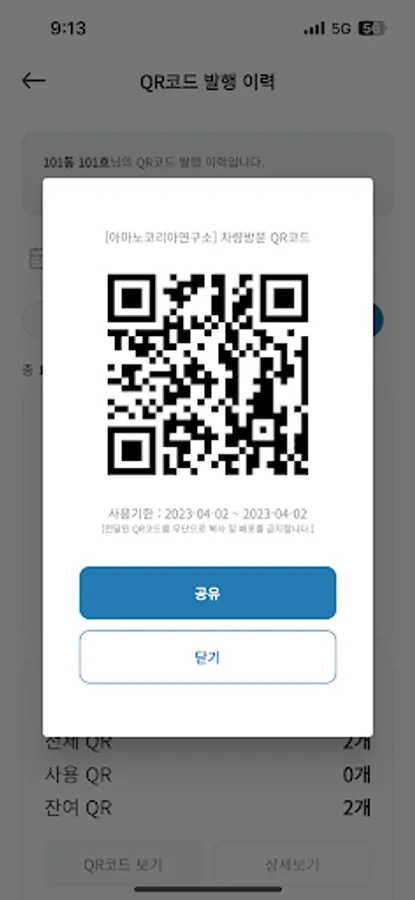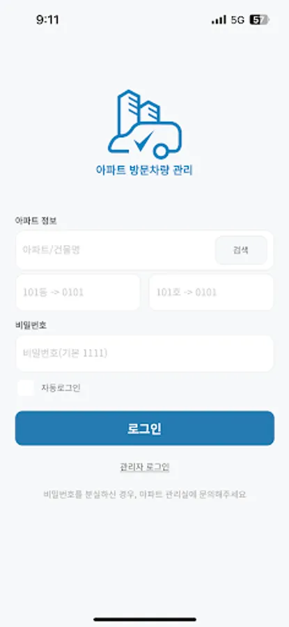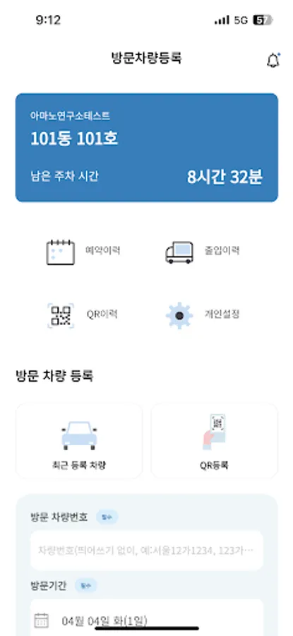 Amano Korea visiting vehicle management app. Reservation function for each household for visiting vehicles, easy entry function through QR code scanning, function to report unauthorized access vehicles when visiting households for unregistered vehicles, and after entering a 4-digit password without the need for a separate reservation by entering the passcode issuing kiosk password available