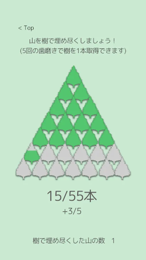 さらに、このアプリでは、歯磨きを5回行うたびに、山に樹を1本植える事ができ、ゲーム感覚で楽しく歯磨きを行え、『マインドフル歯磨き』を続けるモチベーションアップにもなります。例えば、週5回『マインドフル歯磨き』を行うと、約1年で山が55本の樹でいっぱいになり、次の山に挑戦する事ができますので、山を樹で満たす達成感が得られると共に、樹を植えていくという行為によって心が和む効果もあります。