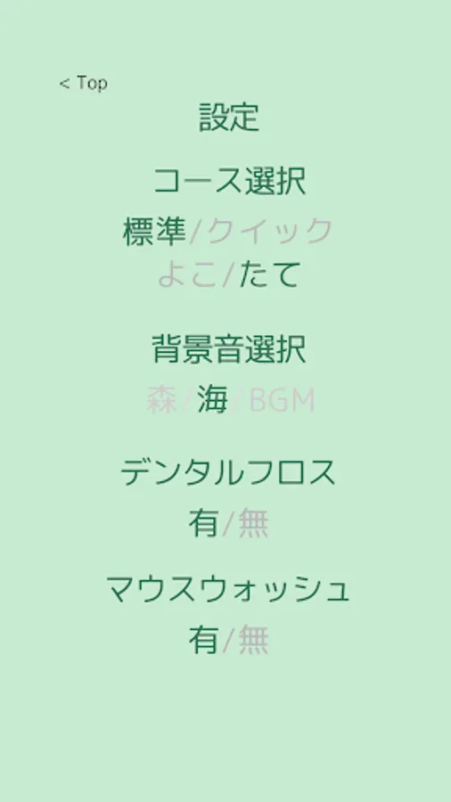 *メニュー設定では、 [BGMサウンド] 以外に、[歯ブラシの縦磨き・横磨き]、[歯磨きスピード]、[デンタルフロス・マウスウォッシュの有無] を選択して、自分のやりやすい磨き方や、好みの歯磨き時間にカスタマイズする事が可能です。