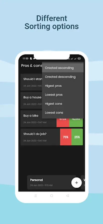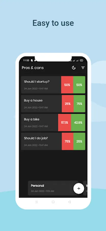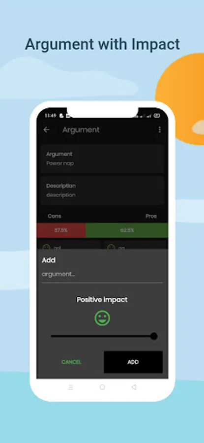 Make decision better with our app, add argument or decision then add pros or cons with negative or positive impact then compare. You can add arguments or decision with categories with dark & light theme it is easier & UI friendly. There are many sorting options so you can make better decision. Managing argument or decision pros & cons is much easier with side by side comparasion.