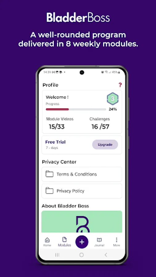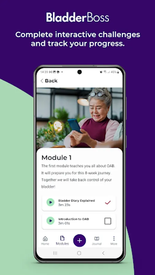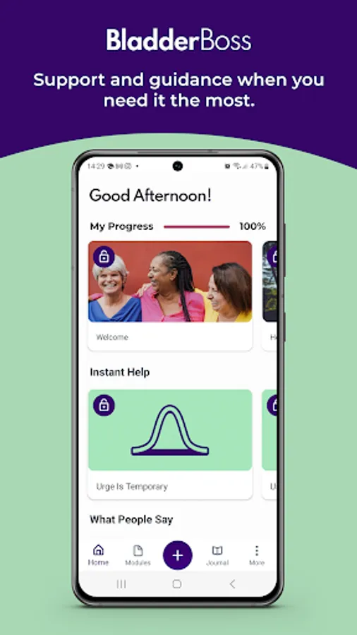 BladderBoss provides an educational and interactive eight-week program that has been developed by world-leading overactive bladder experts in physical therapy, psychology and urogynecology. The program consists of eight easy-to-follow weekly modules where you will be guided step-by-step through science-backed techniques and engaging challenges. Taking a holistic approach, BladderBoss will equip you with all the tools you need to understand Overactive Bladder, retrain your bladder, transform your behaviors, strengthen your pelvic floor and work towards personal goals - all on your own terms.