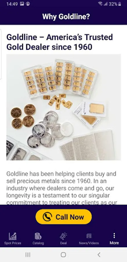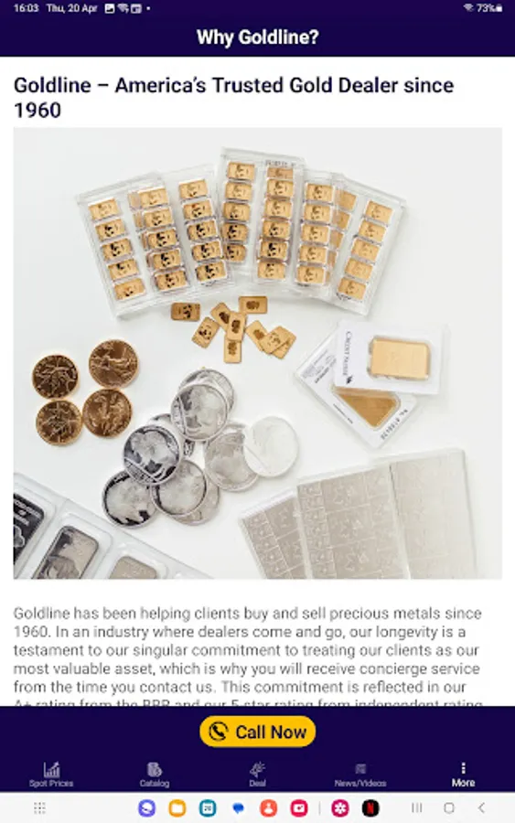 Goldline, America’s trusted gold dealer since 1960, brings you an informational app to help you stay on top of the precious metals market. This app provides live metal spot prices with historical charts, relevant industry news articles and videos as well as access to Goldline’s catalog of products and its deal of the week. Precious metals investors will appreciate the easy access to detailed product information including coin images and descriptions readily available to them. For those interested in purchasing gold, silver or other precious metals, the app provides access to a “call now” button to contact Goldline directly.