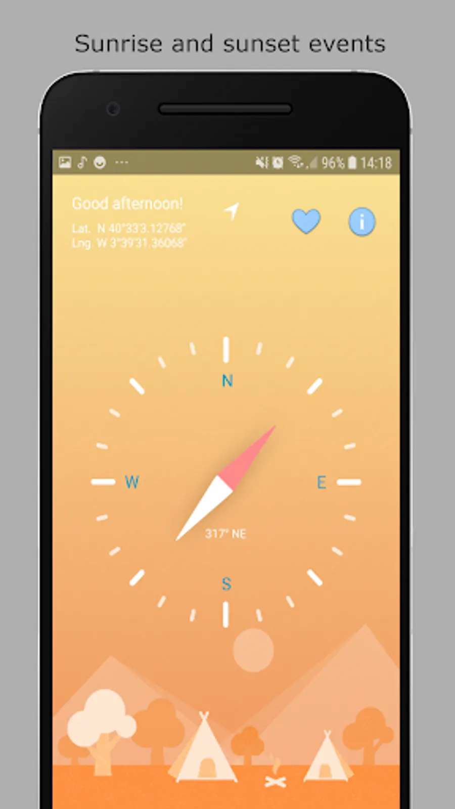 Compass with awesome design related to sunrise and sunset events. Clear, and simple to use.