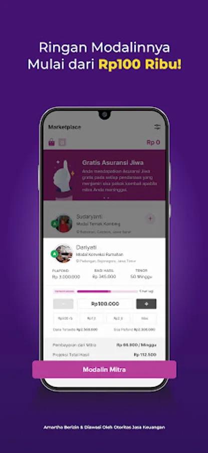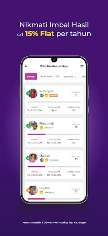 Starting from Rp. 100,000, you can start investing in UMKM from Rp. 100,000. You can generate weekly passive income with a flat 15% profit per year.