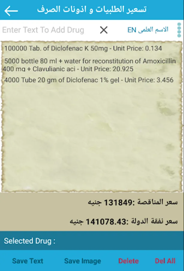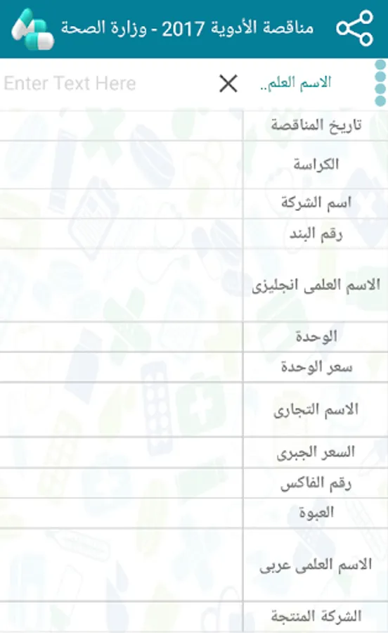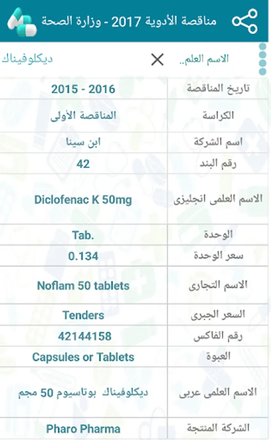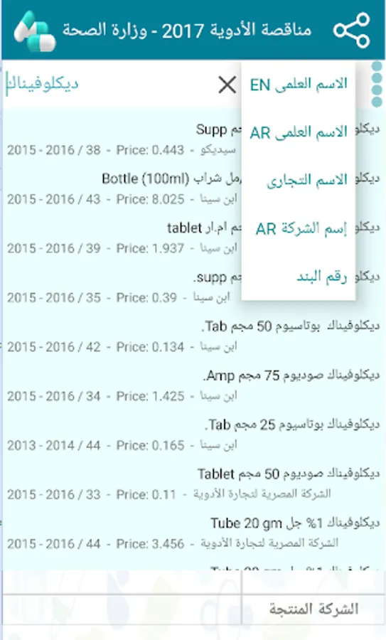 (Active ingredient Arabic - active ingredient English - unit - unit price - packaging - distributed company)